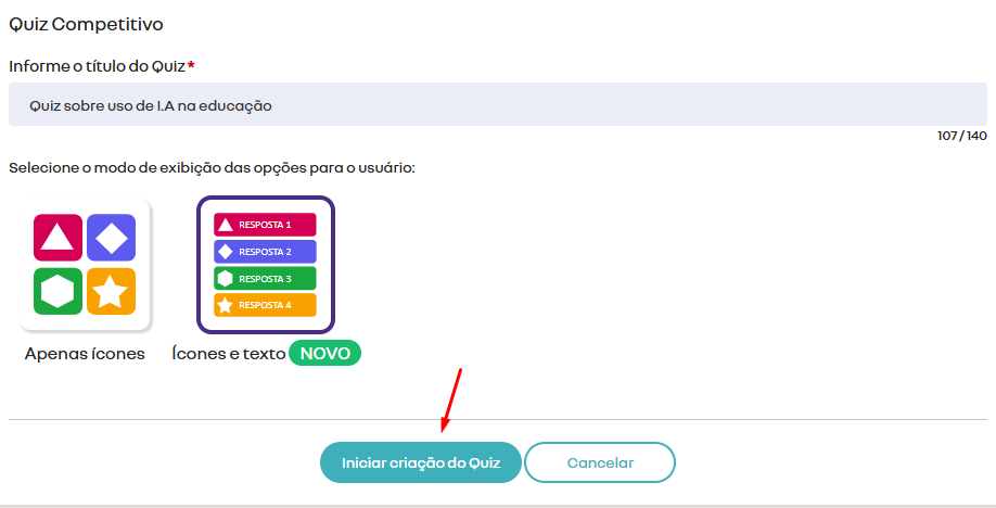 2️⃣Adicione um título para seu quiz e escolha como as respostas serão exibidas e clique em Iniciar criação.
